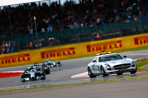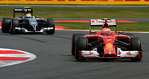 與陰雨的星期六不同,周日下午Silverstone賽道上空晴朗,降雨機率僅有30%。因為排位賽策略不佳而落至後半段的Ferrari與Williams面臨著從後方挺進的壓力,也讓2014年英國站的起跑讓人期待。五個紅燈熄滅後,第2位起跑的Sebastian Vettel飽受威脅,一起跑便陸續為Jenson Button、Kevin Magnussen所超越,不久後也遭受Lewis Hamilton超越,第1圈還未結束也落居至第5。但後方的Kimi Raikkonen在Wellington路段失誤衝出賽道,在回到賽道時賽車發生失控而撞上護欄,再次彈回賽道牽連到無可閃避的Felipe Massa。這場嚴重的事故,不僅造成Kimi Raikkonen與Felipe Massa兩人退賽,護欄受損也迫使賽會出示紅旗,為了修復護欄也因此造成比賽中斷達1個小時之久。