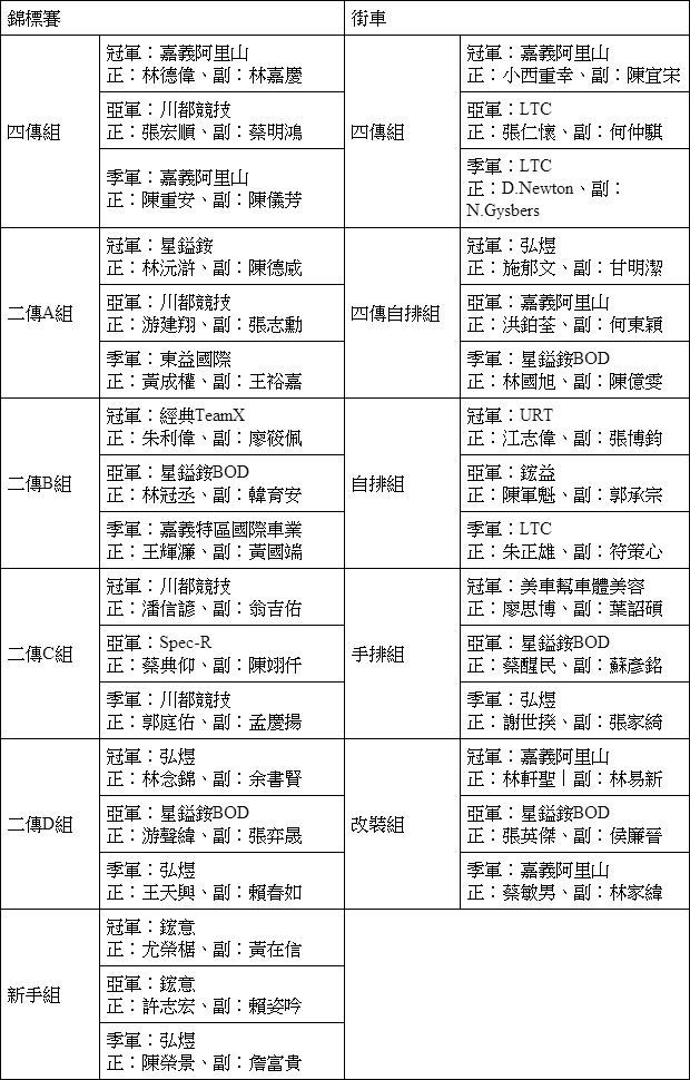來看看競爭最激烈的錦標賽這組:擁有七屆台灣拉力冠軍的林沅滸,在挑戰錦標賽二傳A組,以4分07秒奪得冠軍,而在中國CRC發展的林德偉,也在錦標賽四傳組的拿到4分07秒的冠軍,巧的是這兩位以不同驅動形式,竟然跑出相同的秒數,實在令人不得不佩服林沅滸的實力。