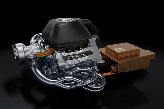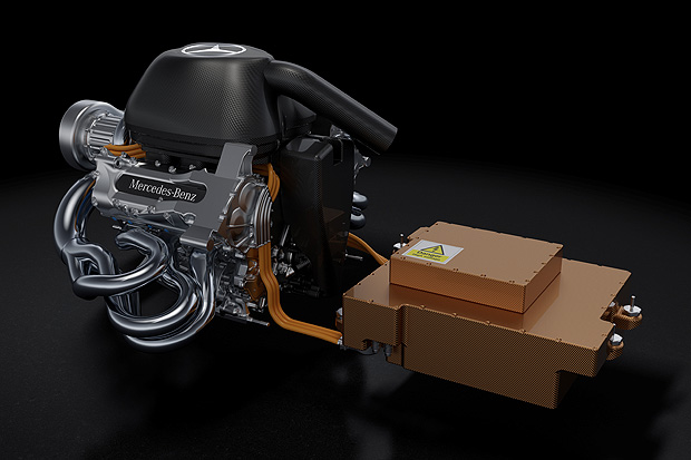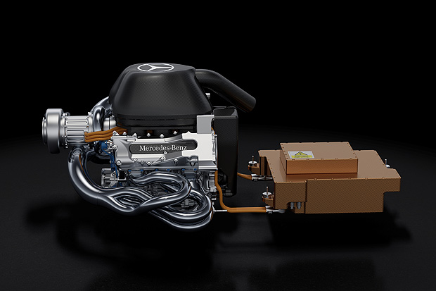 比起Renault與Ferrari,Mercedes-Benz採用了不同的設計思維,雖然在MGU-K動能回收系統的安裝位置與其他兩家引擎供應商相同,但MGU-H卻從渦輪器中獨立而出,也就是說Mercede-Benz將傳統相互連結的廢氣渦輪與壓縮渦輪一分為二,僅將廢氣渦輪保留在與排氣管相互連結,也是賽例所規範的位置。而與MGU-H相連、也是實際扮演增壓器角色的的壓縮渦輪,則是移往引擎的前方,並安裝於V型汽缸夾角間的位置。