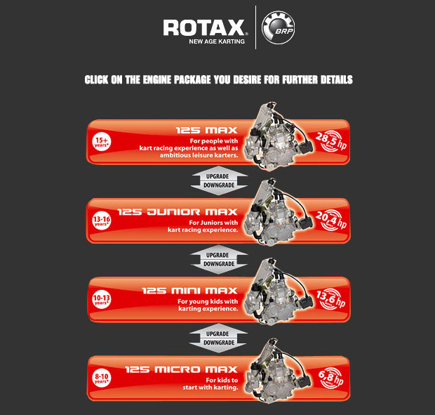 為了讓所有年齡層皆可適用,此系列引擎Rotax原廠提供四種更換套件以適用所有年齡,不須更換引擎其可調整馬力從6.8匹到28.5匹,適用年齡8歲~60歲以上。