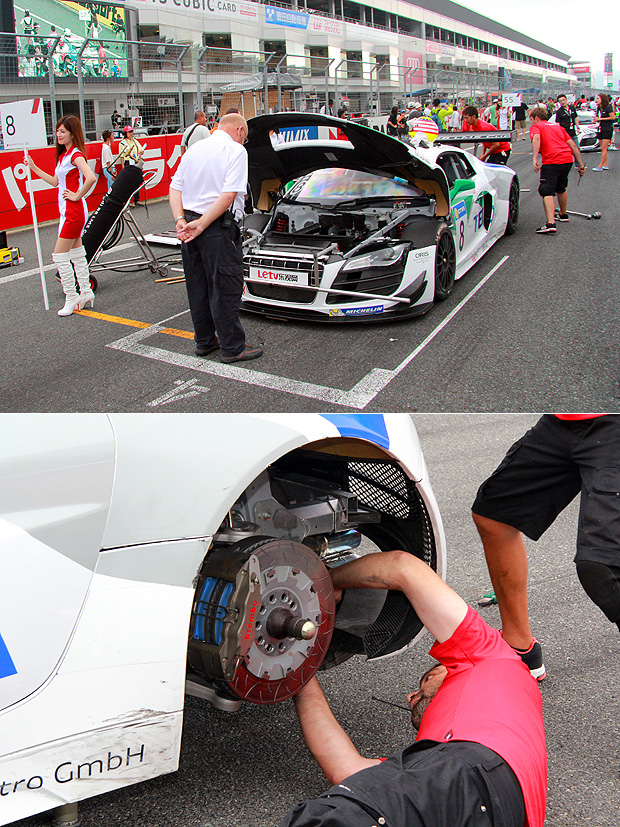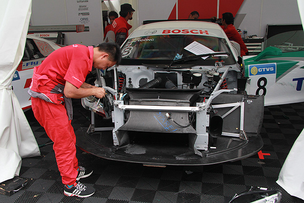 在上午發生事故而引發Safety Car的熊龍,所駕駛的8號賽車在回到車庫後,受損的賽車一度讓人以為難以趕上下午的第二回合比賽。不過,在Audi R8 LMS Cup合作夥伴Absolute Racing的技師努力下,下午開賽前便只剩外觀空力套件的修復,也順利趕上比賽前的Pit Lane開放與繞場圈進入起跑線之中。不過,由於賽道安全官仍未確認賽車是否足以安全進行比賽,技師們仍在起跑線上進行搶修與四輪定位,以求趕上即將開跑的比賽。