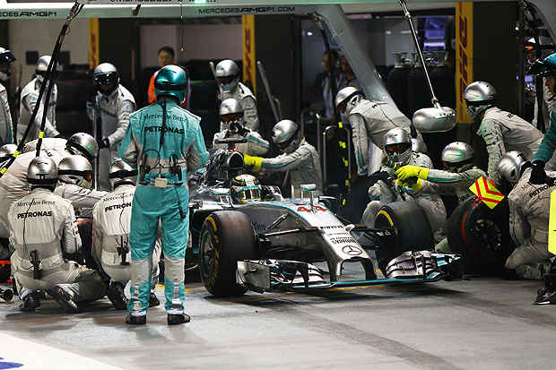 Nico Rosberg因為賽車線組故障的緣故,第一次進站停靠後便無法入檔,只能退賽。