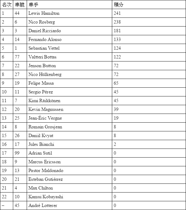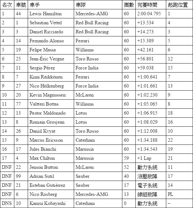 2014 F1新加坡站比賽成績: