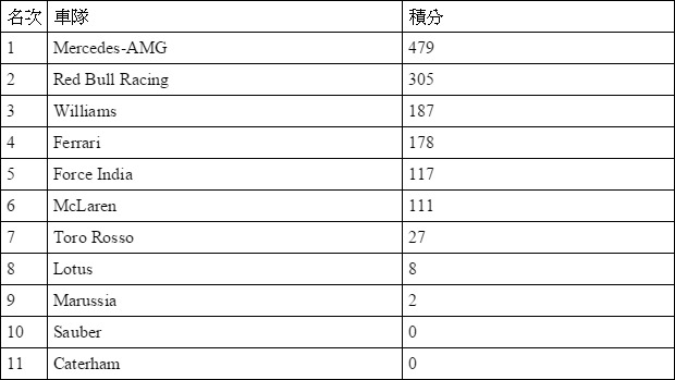 新加坡站賽後車隊積分榜: