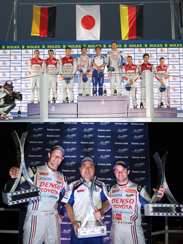 這次Toyota終於成功壓制Audi,並奪下參賽WEC的首勝。下圖左至右分別為奧地利車手Alex Wurz、TMG總裁木下美明(Kinoshita Yoshiaki)、與法國車手Nicolas Lapierre。