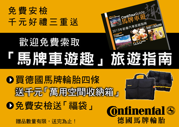 即日起至2月8日止,德國馬牌輪胎特別推出「輪胎安檢回娘家」活動,車主只要至德國馬牌輪胎全省經銷店即可享有輪胎安全檢查服務,除了可免費索取「馬牌車遊趣」春節汽車旅遊指南,並能獲得「迎春福袋」乙個,同時,只要於活動期間內(即日起至2月8日止)至德國馬牌輪胎全省經銷店購買四條輪胎,再贈送價值千元的「萬用空間收納箱」乙個,贈品數量有限,送完為止喔!