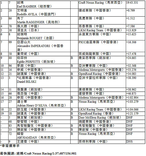 目前,班博憑藉4分優勢位列亞洲保時捷卡雷拉盃2013積分榜首位,馬丁排在第二,艾明達排在第三,落後馬丁10分。B組中,伯菲特領先第二名的新加坡車手陳友賢36分,李超以1分之差排在第三。