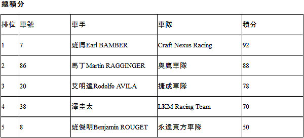 Craft Nexus Racing的班博(Earl Bamber)憑藉出色表現贏得第二場勝利,超過奧鷹車隊的馬丁(Martin Ragginger),躍升至積分榜首位。馬丁在第五回合比賽中獲得季軍,捷成車隊艾明達(Rodolfo Avila)獲得亞軍,這也是艾明達本週末第二次登上領獎臺。