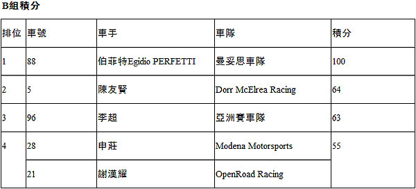 B組中,積分榜領先者伯菲特(Egidio Perfetti)獲得冠軍,進一步擴大了積分榜領先優勢。亞洲賽車隊的李超獲得第二名,OpenRoad Racing的謝漢耀獲得第三。Dorr McElrea Racing的陳友賢在最後一圈打滑,憾失季軍。
