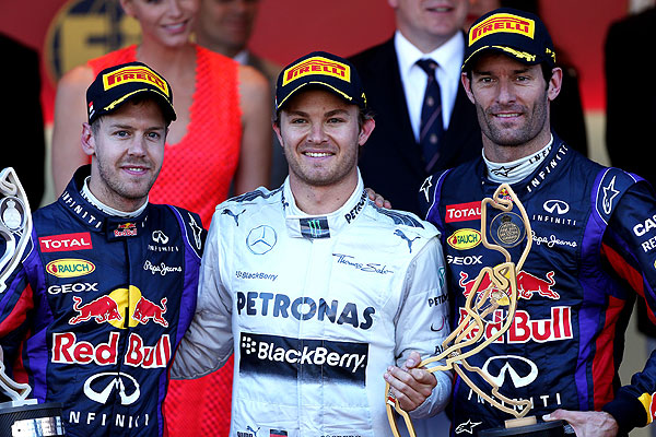 2013 F1摩納哥站前三名分別為Nico Rosberg、Sebastian Vette與Mark Webber。
