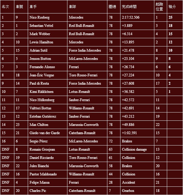 Nico Rosberg不僅終於將桿位兌換成分站冠軍,同時也與其父親Keke Rosberg一同成為F1史上首對父子皆在Monte Carlo賽道奪下分站冠軍的父子檔。