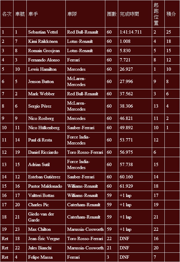 Vettel總算拿下生涯第一場家鄉德國站的金盃,Kimi與Grosjean兩位Lotus車手也一齊站上頒獎台。