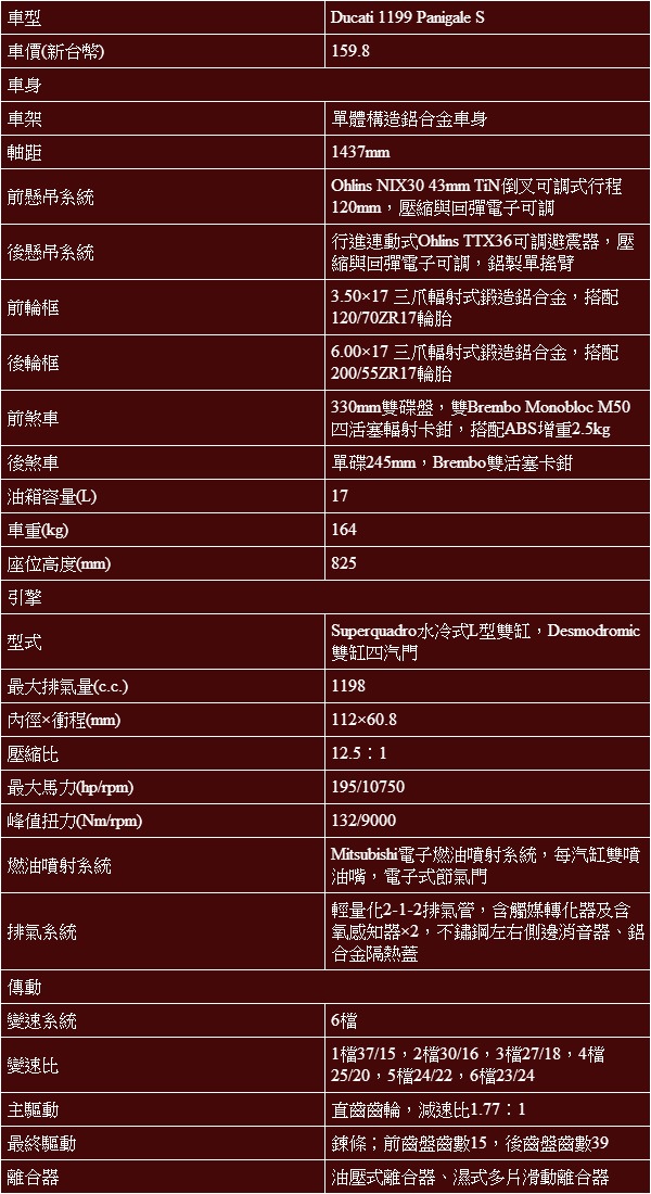 Ducati 1199 Panigale基本規格