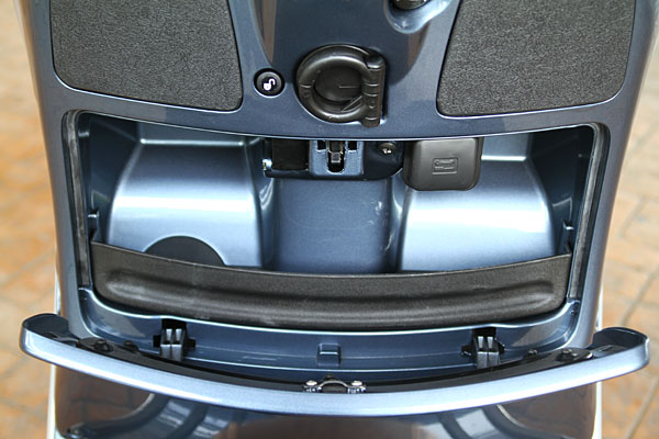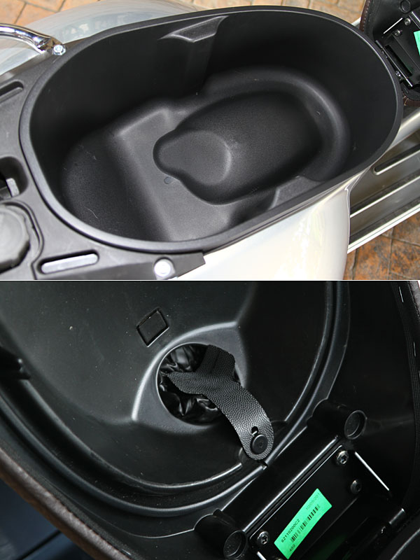 坐墊下置物空間一覽,無法放入此次騎士配戴的Lubro Race Tech Final Edition 3/4帽款;為了避免皮質座椅受到風吹日曬的摧殘,下方設計有專屬雨衣,相當適合台灣用車環境。