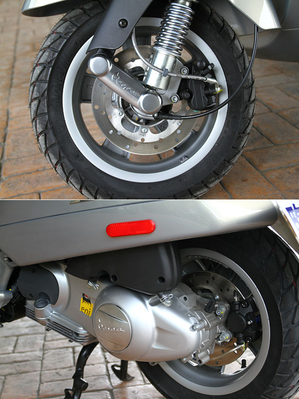 單搖臂式的前避震,與後雙避震設計,很對台灣道路的頻率,與常見的潛望式前叉相比,少了些直來直往的快速反應,換得的是較為中庸的不急不徐,猶如太極般的將衝擊以柔克剛,又可在彎道進出時給予足夠的支撐而不過分軟腳,除了通勤,偶爾的熱血旅程,GTS 300ie與GTS 300ie Touring都不會讓你太過失望。