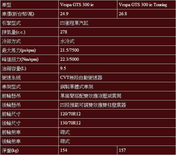 Vespa GTS 300ie與GTS 300ie Touring三視圖與基本規格表