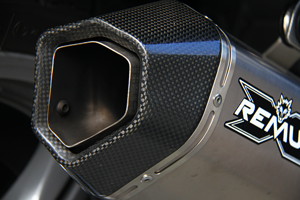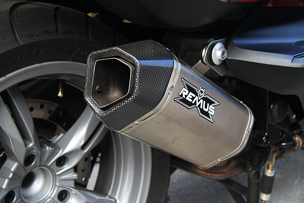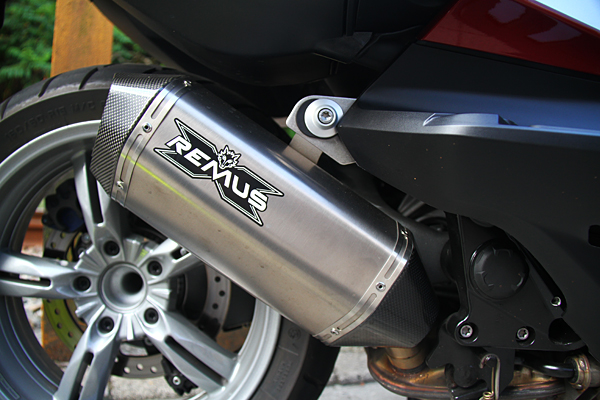 對應於C 650 GT此輛BMW打造的大綿羊,Remus一口氣推出了三種不同材質的排氣尾管,由於車主的自身偏好,選擇了鈦合金的款式,歐洲報價含稅為561歐元,且因此材質與較為短翹的設計,讓其重量僅有1.54g。
