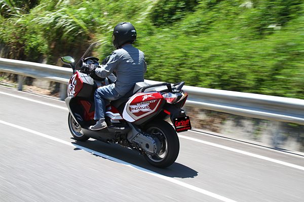 在整日的相處中,從台北出發經過106線道,抵達福隆海水浴場的來回奔馳,安裝上Remus排氣管的C 650 GT展現較原廠活潑許多的低速調性。轉動油門,隨著開度的多少,排氣聲浪伴隨著明顯的動力推進,有著零時差的快速反應,也因此改變,讓此大傢伙不僅於起步加速更添威猛,於彎道上的油門控制也可以更細膩,對於騎乘樂趣,無疑更為加分。