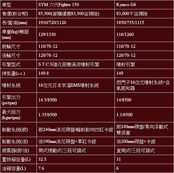 僅提供150c.c.規格的全新第六代Fighter,未來導入市場後主要面對的是氣冷150等級對手,如Kymco的G6或Racing車型,至於銷售表現同樣不俗的Yamaha 12吋規格車型Cygnus,由於僅有125c.c.動力,則不在此次規格表的比較名單中。不過以全新第六代Fighter發表上市時,原廠人員不斷強調其高改裝潛能的重點看來,SYM三陽機車仍希望全新第六代Fighter能威脅主導改裝與賽車市場的Cygnus車型,至於未來市場表現如何,值得期待。