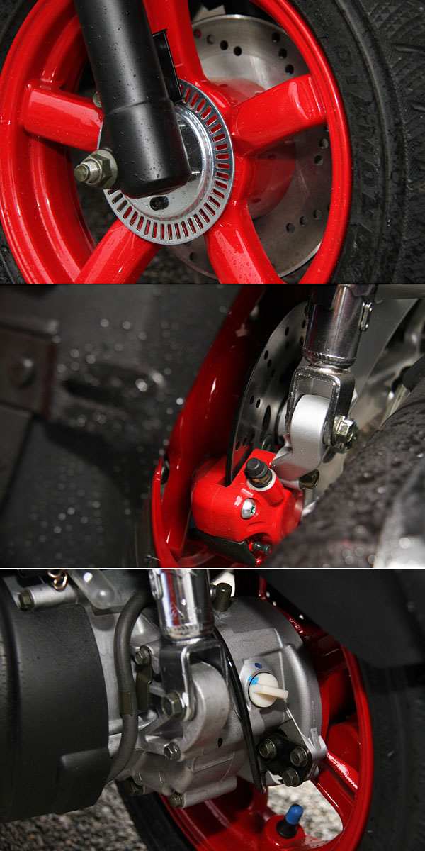 安全系統的設定上,J-BuBu 115配備前後大尺寸碟盤,搭配金屬油管,加上Bosch ABS的精準控制;而在後輪的轉速感側盤隱藏於輪轂內,不如前軸外露。