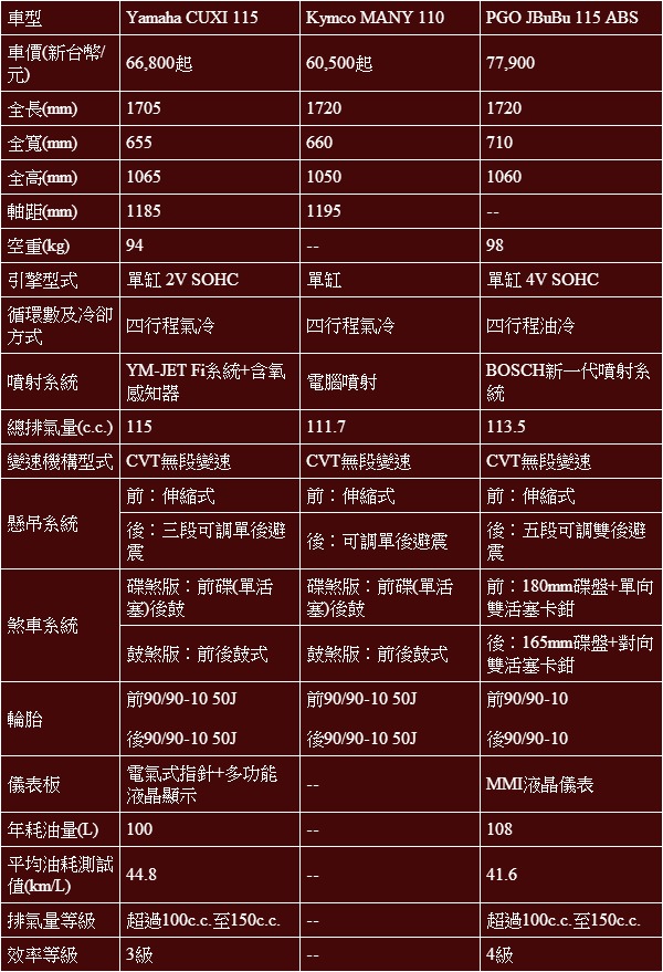 從以上一字排開的競爭對手中,除了CUXI為開朝元老的潮流始祖外,Many與mii同樣在代言人的強勢魅力中,有著不容小覷的市場魅力,而PGO JBuBu 115 ABS雖然沒有走向與對手相同的代言人思維,但卻以最佳的規格,於動力、制動面強化,期望以配備規格戰打贏對手的代言人魅力,對於消費者而言,也無疑是值得推薦的另一選擇。