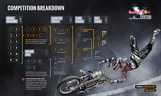 本屆Red Bull X-Fighters堂堂邁入第14個年頭,總共有12位參賽者共來自九個國家。其巡迴賽事總計共設五個賽站,除了在全世界海拔最高的城市-墨西哥城熱血開戰,緊接著賽事更橫跨歐亞非三洲,依序包括日本、德國、西班牙及南非。墨西哥站參賽明星車手包括:2013年世界冠軍托馬斯.佩吉斯Tom Pages(法國)、2013年亞軍丹尼.托雷斯Dany Torres(西班牙)、雷米.比祖阿Remi Bizouard (法國)、李維.舍伍德Levi Sherwood(紐西蘭)、羅勃.艾德伯格Rob Adelberg (澳大利亞)、哈維爾.維勒加斯Javier Villegas (智利)、喬什.席漢Josh Sheehan(澳大利亞)、利波.波德莫Libor Podmol (捷克)、亞當.瓊斯Adam Jones (美國)、麥可.梅勒羅Maikel Melero (西班牙) 、克林頓.摩爾Clinton Moore (澳大利亞),以及艾瑞克.路易茲Erick Ruiz (墨西哥)。