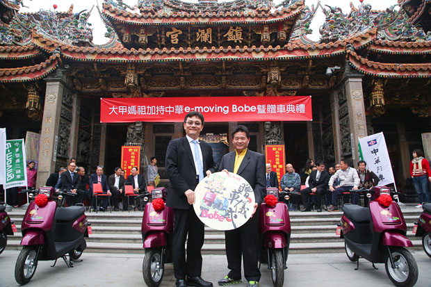中華電動二輪車積極拓展市場有成,迄今累計市佔率近七成。此次與大甲媽鎮瀾宮所合作推出的「e-moving Bobe大甲媽祖加持版」特仕車,除了具有免牌、免照、免加油的優點之外,車身設計更融入Q版媽祖元素。車身除了有大甲媽祖保庇字樣的金色車身貼紙,車把手還繫上經過大甲鎮瀾宮過爐加持的紅彩及平安符,車尾還有專屬媽祖車型牌,現在買車還送e-moving金箔媽祖平安吊飾,不管車子或贈品,都經過大甲媽祖的加持祈福儀式,騎乘之時,也感受到大甲媽祖的保庇與疼惜。