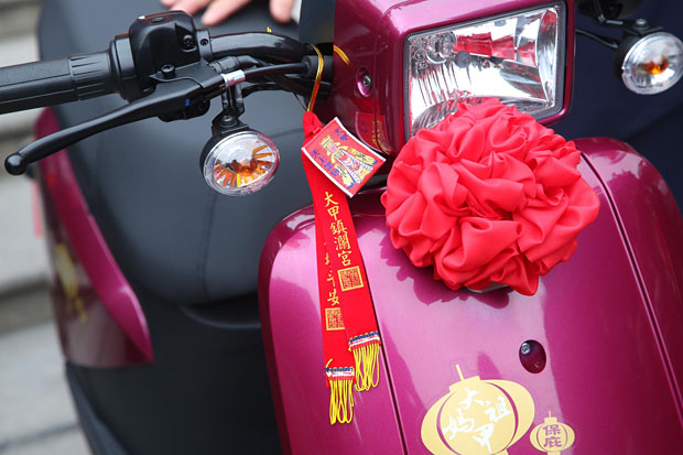 Bobe加持版特仕車把手特別繫上經過大甲鎮瀾宮過爐加持的紅彩及平安符。