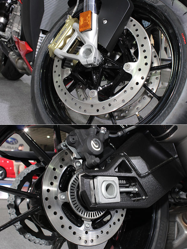 前後煞車規格為雙對向四活塞輻射式卡鉗搭配雙浮動式碟盤,直徑320mm;後煞車規格則為單活塞浮動式卡鉗搭配固定式煞車碟盤,直徑220mm。