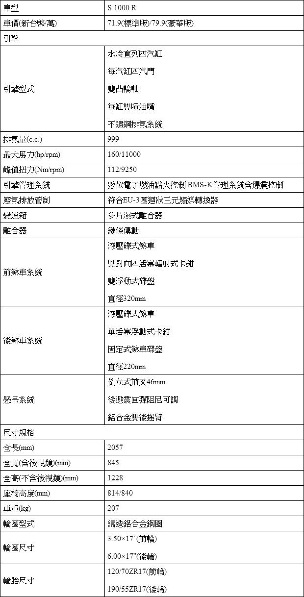 S 1000 R選擇南港車展登台,提供標準版與豪華版兩種車型,售價分別為新台幣71.9萬與79.9萬。