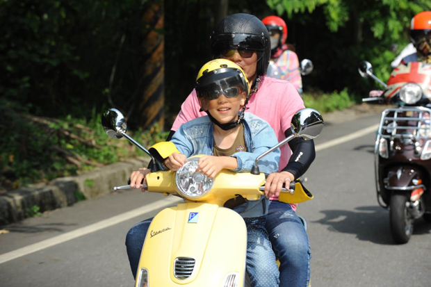 父子一同享受在山區騎乘Vespa的樂趣。