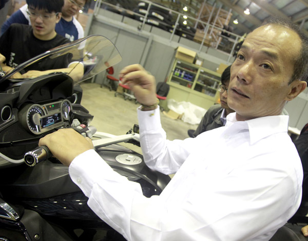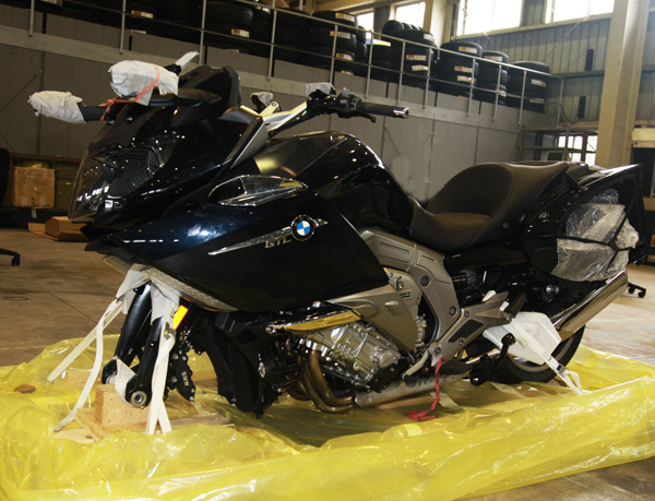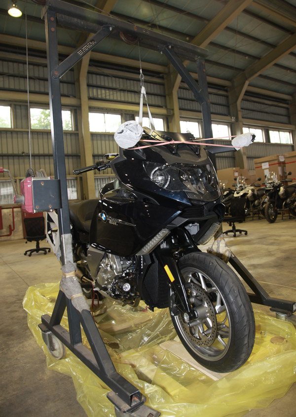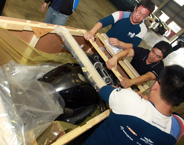 這開箱儀式可不是將木箱卸下之後,就能將BMW K1600 GTL直接騎走;由於車高的關係,K1600 GTL在木箱中包含前輪、風鏡、下整流蓋等配件都已經先卸下,因此由全台灣第一位K1600 GTL車主,也就是台灣BMW汎德摩托車車主俱樂部的潘會長親自拆開紙箱後,汎德的工作人員便開始忙碌著從前輪開始一一將配件裝上;直到大致上完備之後,潘會長便發動直六引擎,開啟識別度極高的頭燈,正式宣告首部K1600 GTL在接下來完成掛牌手續之後,即將在台灣上路。