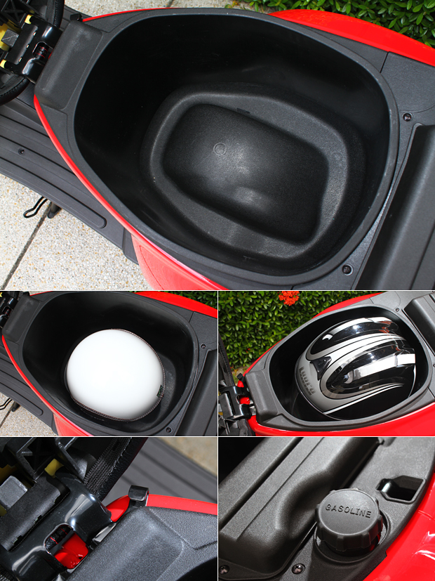 座墊下空間一覽,可完全塞入vespa原廠半罩式安全帽與好運車業代理的Lubro Race Tech 3/4罩式安全帽。
