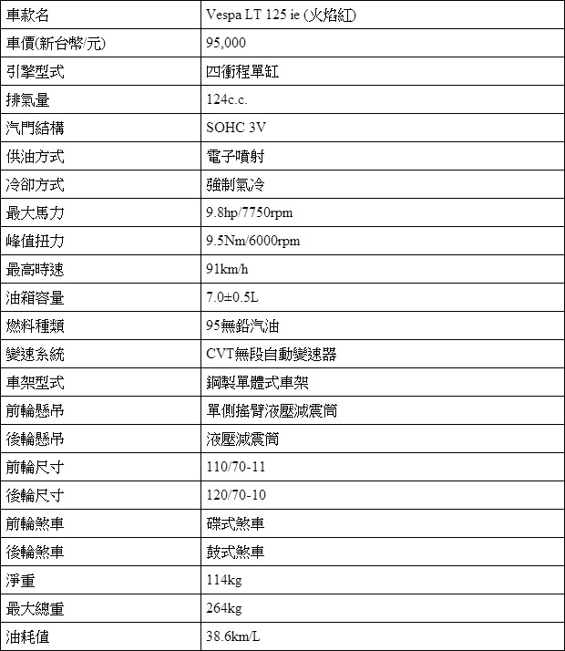 Vespa LT 125基本規格表