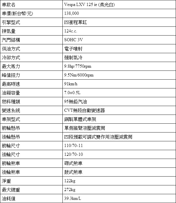 過去,Vespa曾於臺灣推出GTV 300ie,那分離式的座墊,小風鏡與後貨架,再搭配上金屬裸把與獨立儀表的造型,最後以位於前土除上的頭燈畫龍點睛,猶如羅馬假期中的義大利風情再次復刻。隨著GTV 300ie於臺灣市場的告別,喜愛此股濃郁懷舊設計的騎士們也別因此擔心,先前推出的LXV 125,以相同的復古情懷打造,且僅125c.c.的車身規格,以更低的入手門檻,擁抱這義大利專屬的移動個性。