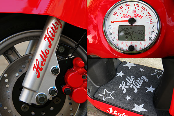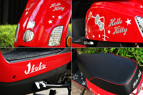 Hello Kitty X J-BUBU有著諸多專屬的可愛設計,包含有Hello Kitty圖案設計包含星星、蝴蝶結及專屬的配件,坐墊特殊車縫與Hello Kitty專屬腳踏墊,皆是Hello Kitty官方授權才有的規格。