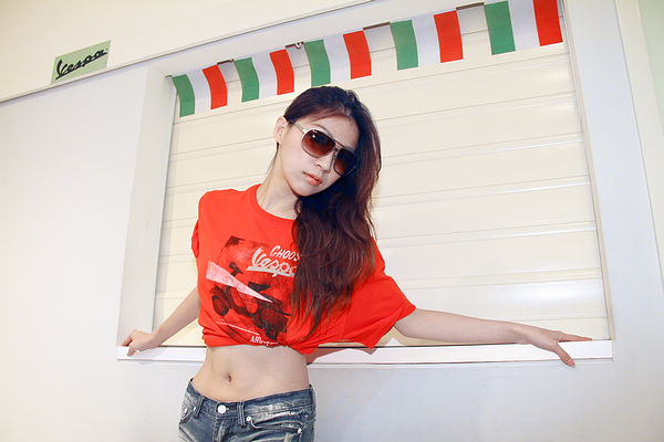 就算是人物單拍,簡單穿上VESPA紅色上衣與墨鏡也很有型。