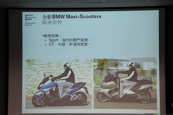 汎德協理呂文智為媒體進行C600 Sport、C650 GT產品說明,首先提到大家關心引進台灣時程延遲至今的原因,一是因為BMW Motorrad原廠為求完美針對動力系統與組裝過程的瑕疵一一改正,因此讓量產時程有所延後,以確定最高品質與耐用度;二是正值2012年式與2013年式車型交界的尷尬期,因此決定全數從2013年式車型開始引進,台灣準車主完全不用擔心會買到2012年式的車型。