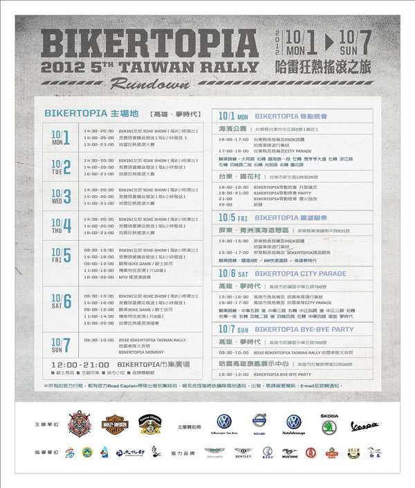 更多活動詳情可至各地哈雷旗艦展示中心、福斯、Skoda、Vespa門市索取,或至Harley-Davidson台灣官網www.harley-davidsontaipei.com.tw下載區下載相關活動行程說明。