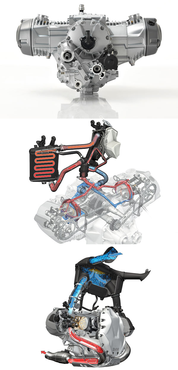 R 1200 GS的經典氣/液冷水平對臥雙缸引擎(Boxer)採用與世界最高規格F1賽車同概念的冷卻方式,為符合未來對車輛性能與噪音、排放的規範,新引擎將原先的冷卻機油更換為冷卻水,輔以經典Boxer引擎特色的氣冷系統,精密設計的雙效散熱系統,提供全新GS更優異的熱效率。