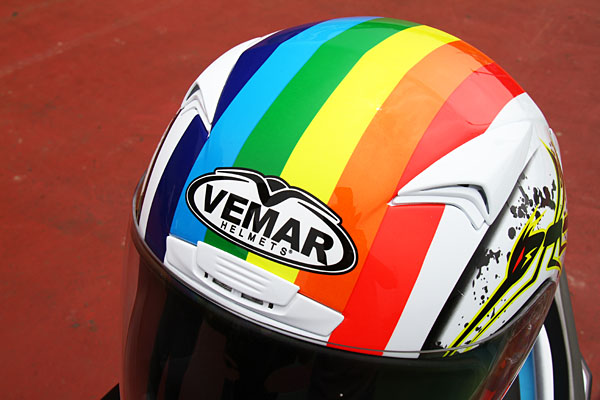 此頂為Alex De Angelis車手的彩繪塗裝,中央以彩虹概念為設計,搭配白底與簡潔流線的帽體,鮮艷的外表容易成為道路上的焦點。