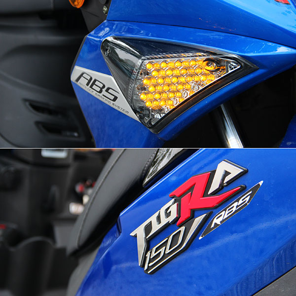 ABS運用於兩輪上,需要計算後輪輸出動力、前後輪輪差、煞車力道等參數後,BOSCH ABS 9M此系統可以利用16bit的控制單元以每秒100次輪速的計算速度,來控制煞車動作性能,也因此在Tigra 150 ABS車型上,你可以發現因導入速度感知讀取盤之後與Tigra 150車型不同的前後碟盤,且前置物盒右方也因置入了控制單元後所犧牲掉的置物空間等;此外,由於ABS具備的速度感應裝置,也因此將原有的數位碼錶線整合,讓前輪軸的控制線組皆處於左側。