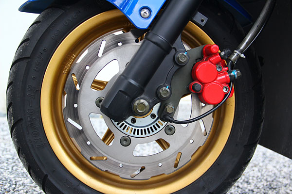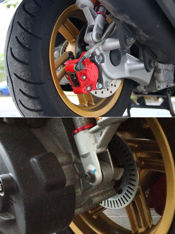 因為多了速度感知讀取盤所以碟盤造型頗有不同,也可說是ABS車型的專有特色;此外,由於ABS具備的速度感應裝置,也因此將原有的數位碼錶線整合,讓前輪軸的控制線組皆處於左側。