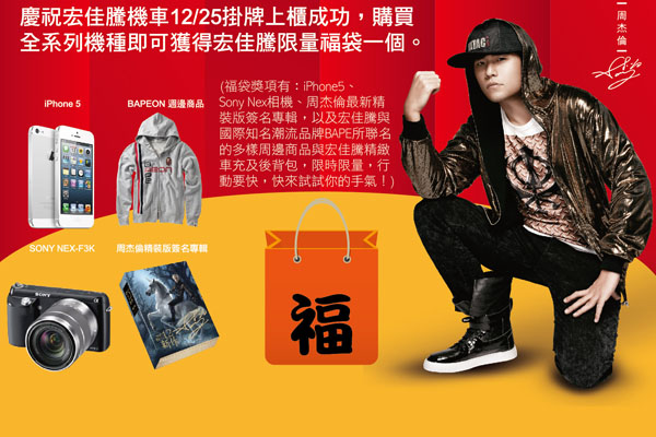 即日起凡購買全系列機種,即可至「宏佳騰機車」官網登入資料,隨機可抽「宏佳騰限量福袋」一個。福袋獎項包含最新最夯Apple iPhone5、Sony Nex相機、也有機會獲得代言人周杰倫最新簽名CD、以及與殿堂級日本潮牌「A Bathing Ape」聯名之BAPEON周邊商品…。活動限時限量,大家行動要快!
