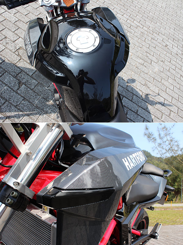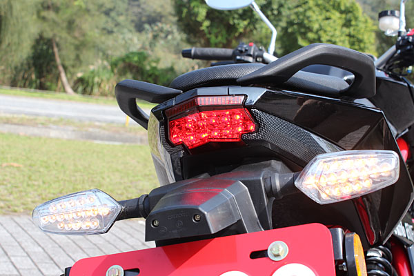 油箱設計具肌力感,對於雙腿固定造型具親和力,但可惜因應法規,原先設至於油箱前端兩側的方向燈設計移除。