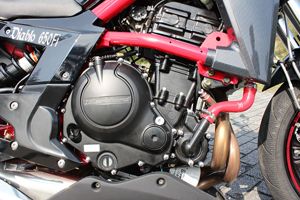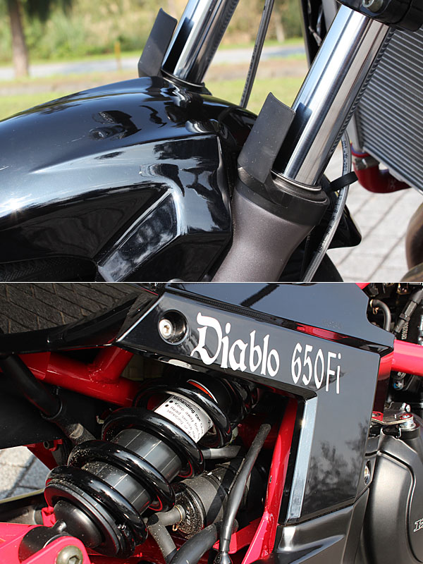 雖然原廠人員表示,經過重新設定的Diablo 650Fi,車架、懸吊與煞車等處與ER-6n不盡相同,但在車架的比對上,兩者的共通性的確相當高,這點帶來了絕大多的優點,如車重的前後均衡分配、日後改裝套件的共通性等,就連引擎位置、排氣管造型與分佈等,就連機油濾心設計,都說明了兩者的兄弟情誼,也因此,改裝套件的共用,自然不由分說了。