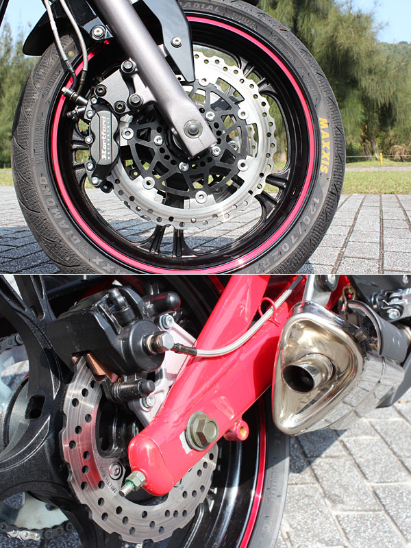 前煞車規格為雙300mm浮動碟盤對應對向四活塞卡鉗;後為220mm碟盤規格。