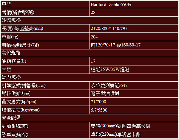 Hartford Diablo 650Fi三視圖與基本規格表