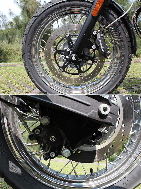 前煞車系統為320mm單碟搭配Brembo四活塞對向卡鉗,後煞車則為260mm單碟搭配Brembo卡鉗設計;煞車力道適中線性,並不過分犀利。