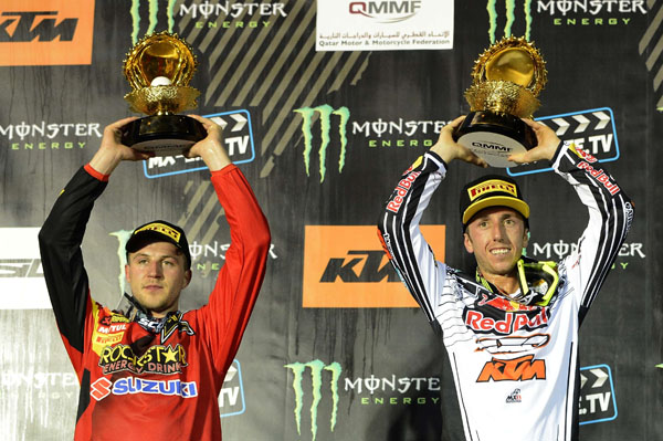 拜全新設計的Super Final賽制所賜,Suzuki廠隊車手Clement Desalle在今年首場賽事後暫時領先現役的世界冠軍Antonio Cairoli,在這場開幕站賽事當中Antonio Cairoli在起跑時並不順利,最終只以第三名的成績完賽。雖然在今年首站賽事現役冠軍因為Super Final這個新規則在總積分排行榜暫時未能登上首位,不過其它Pirelli車手如Ken De Dycker(第4位)、Tommy Searl(第6位)、Kevin Strijobs(第7位)、Steven Frossard(第9位),以及Shaun Simpson(第10位)。在Pirelli選手群陣營,所有車手都選擇Pirelli Scorpion MX MidSoft 32F的前輪搭配MidSoft 32的後輪來迎戰這個軟硬地形兼具,共使用了3,500車次砂土建構完成的卡達(Qatar)越野賽道。